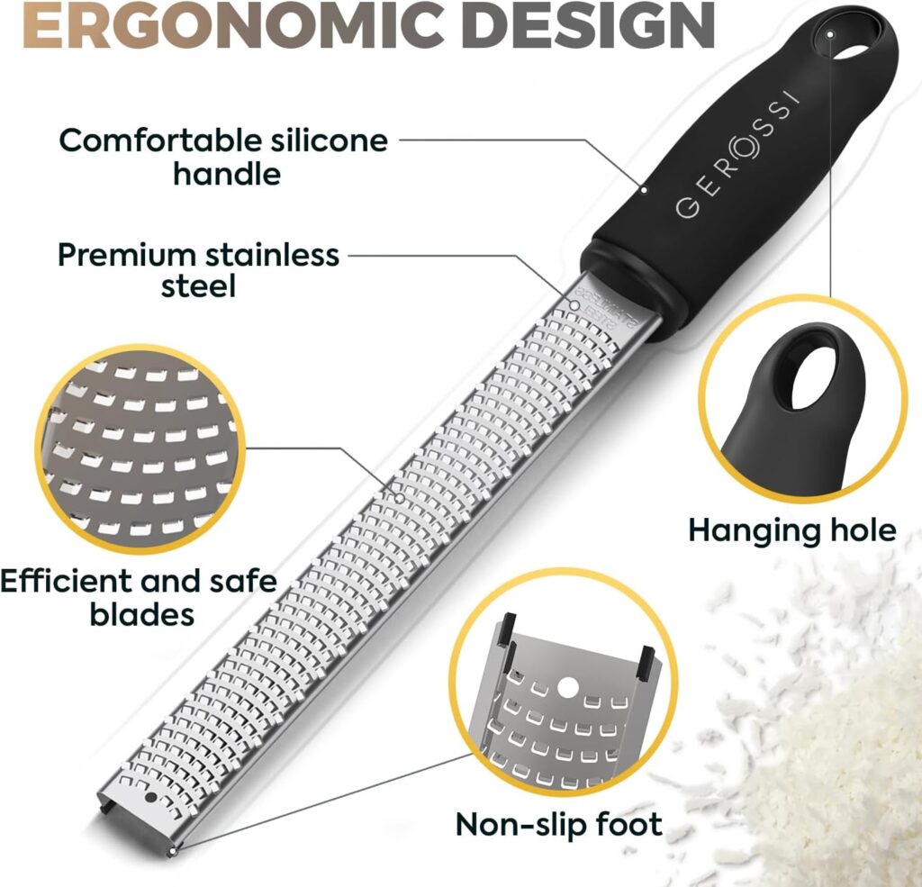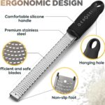 - ZESTER GRATER – Comfortable, non-slip handle. This ginger grater comes with a soft rubber handle, which is designed to give you a better grip. Shred as many ingredients for your recipes without straining your hands.