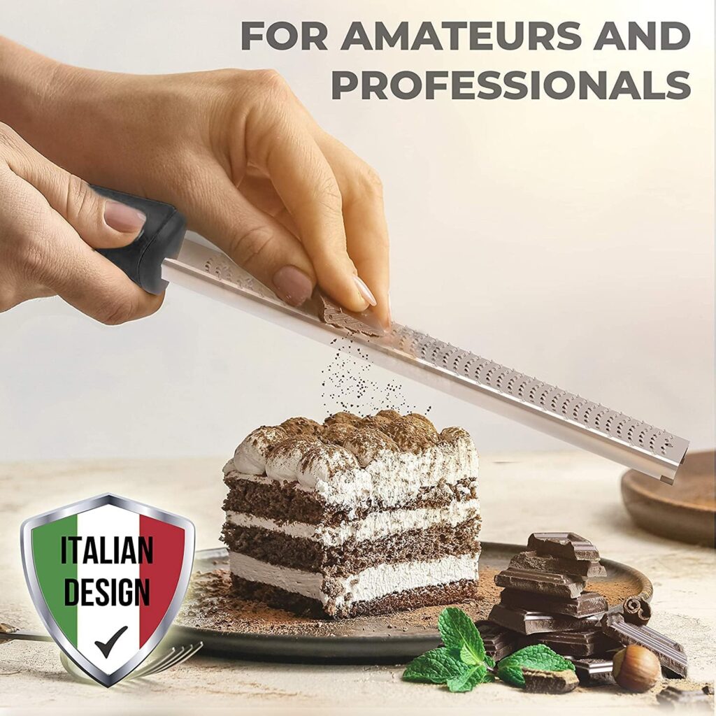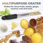 - ZESTER – Add extra flavor to your dish. This zester grater with handle comes with a razor-sharp blade that allows you to easily zest and grate lemons, cheese, ginger, fruits, spices, and vegetables.