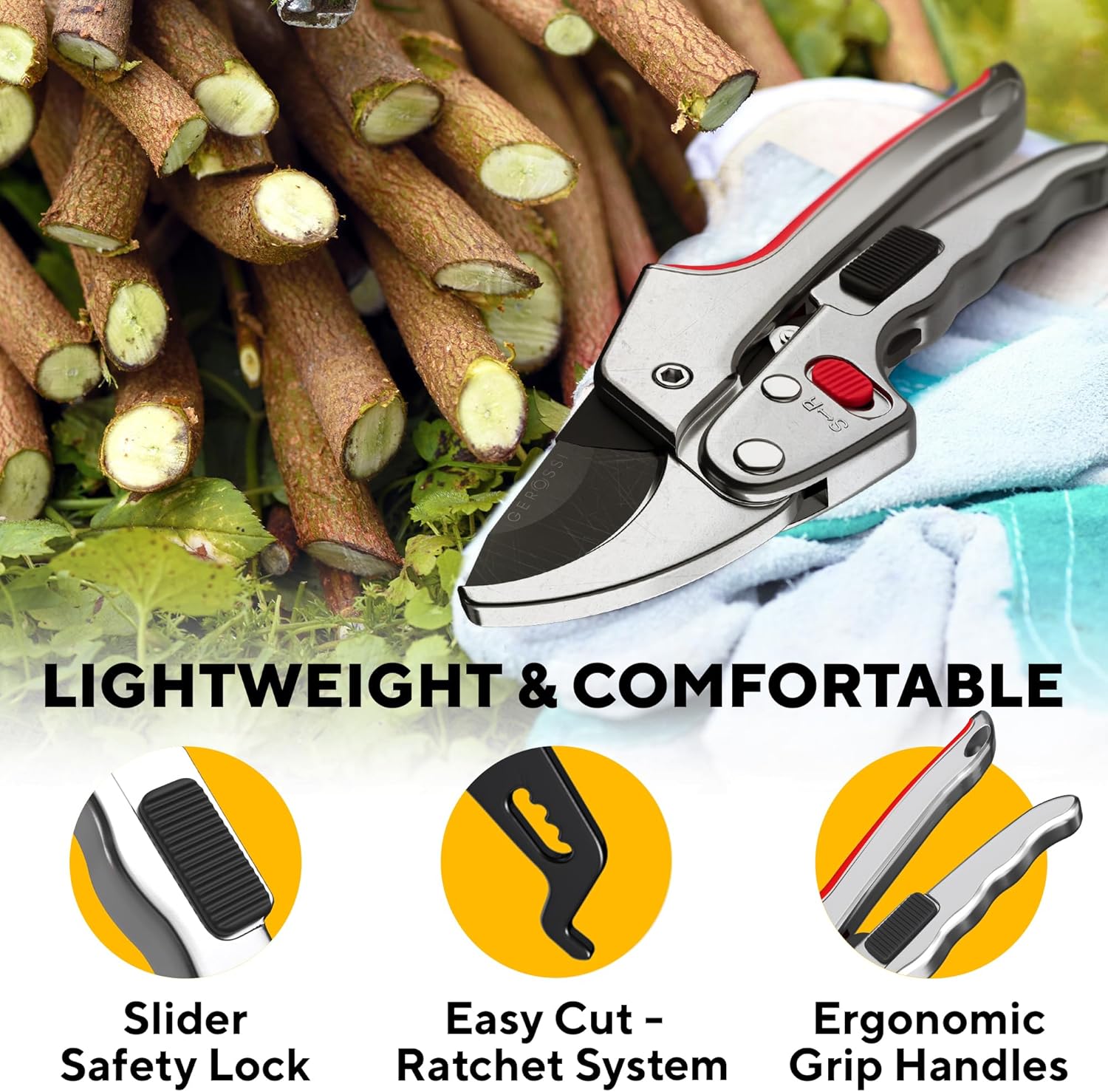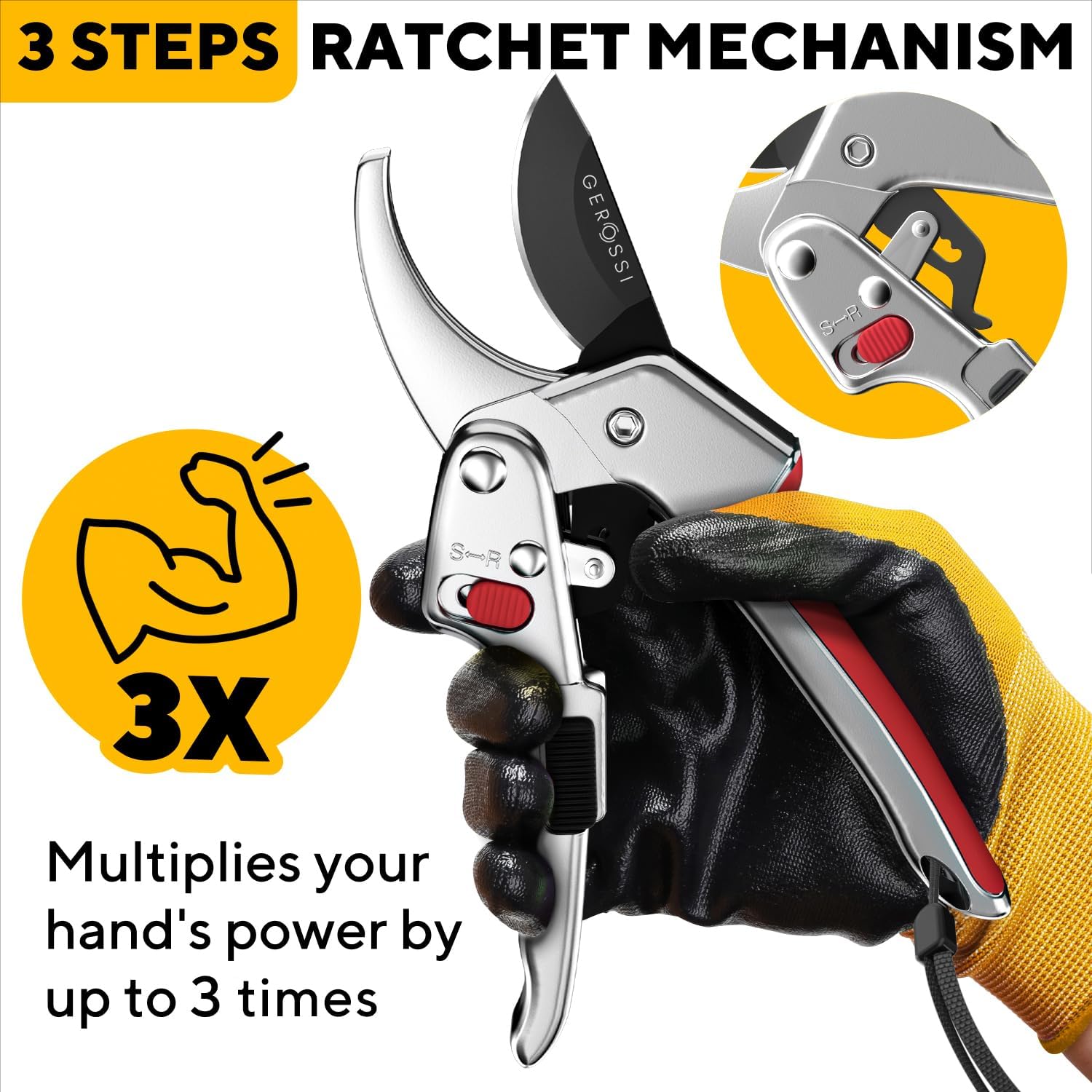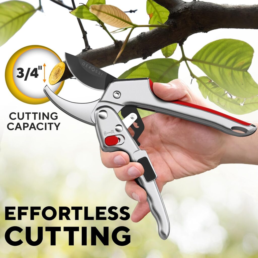 - RATCHET PRUNER – Easily Cut Thick Branches. The ratchet mode multiplies hand power THREEFOLD, making it effortless to cut through tough stems and dried out branches. It makes our pruners an ideal choice for people with Weak Hands, Arthritis, or the Elderly, offering a comfortable gardening experience.