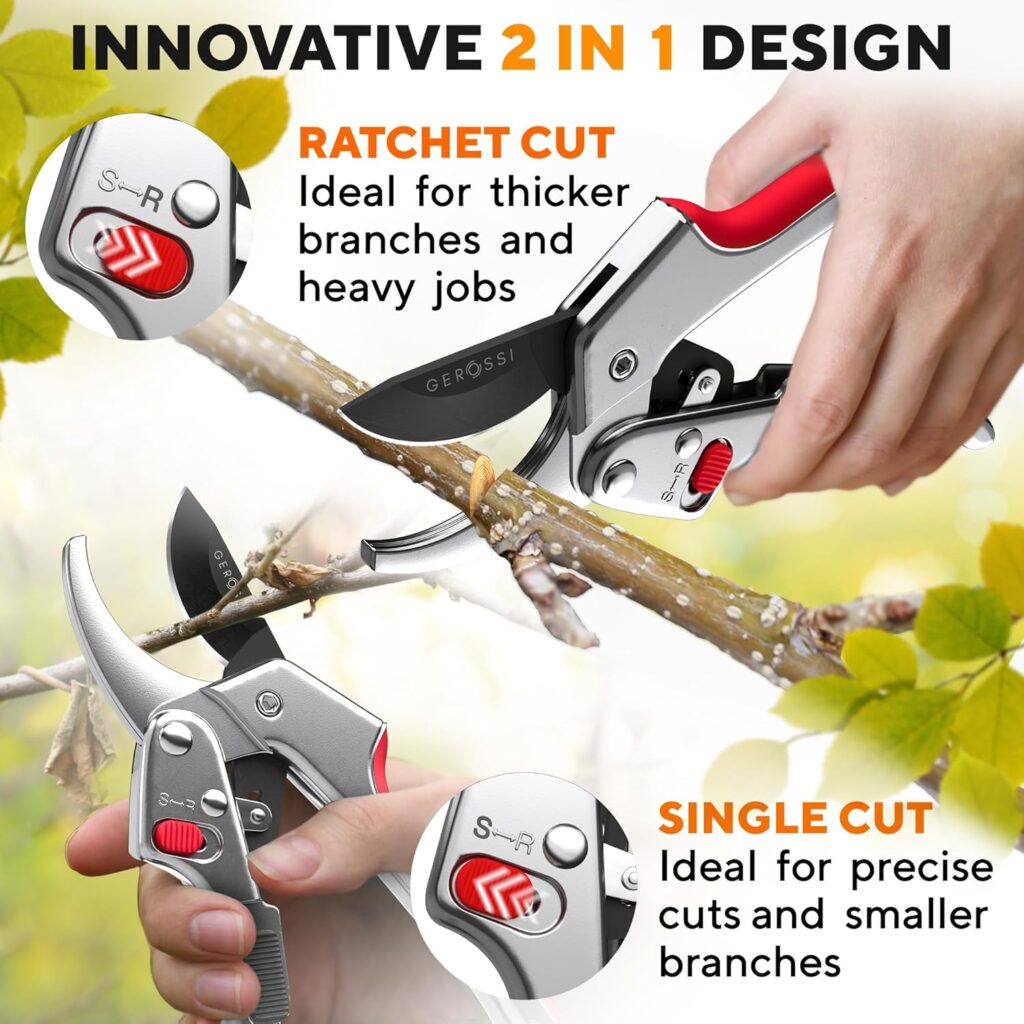 - GARDEN SHEARS PRUNING – 2-in-1 Innovative Design. Our model stands out with its unique design, offering two distinct working modes – the traditional Single-Cut for everyday pruning tasks and an advanced Ratchet-Cut with a 3-step mechanism for dealing with thicker branches.